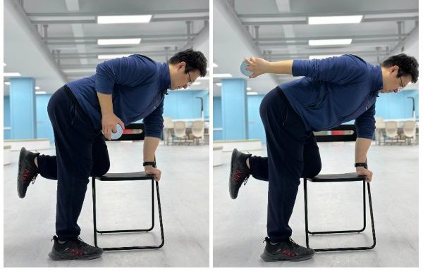 一手撐在凳子上,使身體與凳面保持平行,大臂與小臂之間的夾角為75-90度。單手握住一瓶礦泉水(或2kg啞鈴),然后伸直手臂,再還原,每側(cè)進行12次,重復(fù)3-4組。注意:在做這個動作時,要避免身體的晃動、借力,保持背部的平直,不要彎腰。