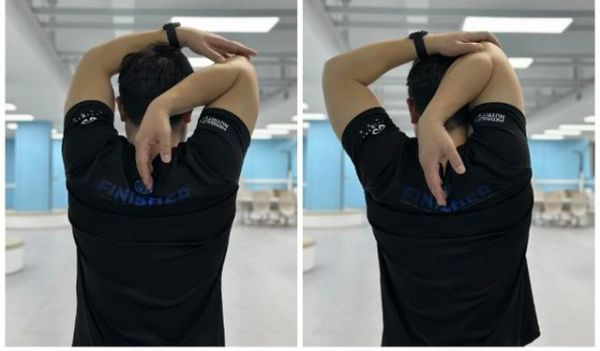 動作要點:把手舉過頭頂;彎曲肘部,使你的手平放在上背部;用另一只手向下、向后推肘部。維持15-30秒后換另一側(cè),兩側(cè)完成為一組,可重復(fù)進行兩組。