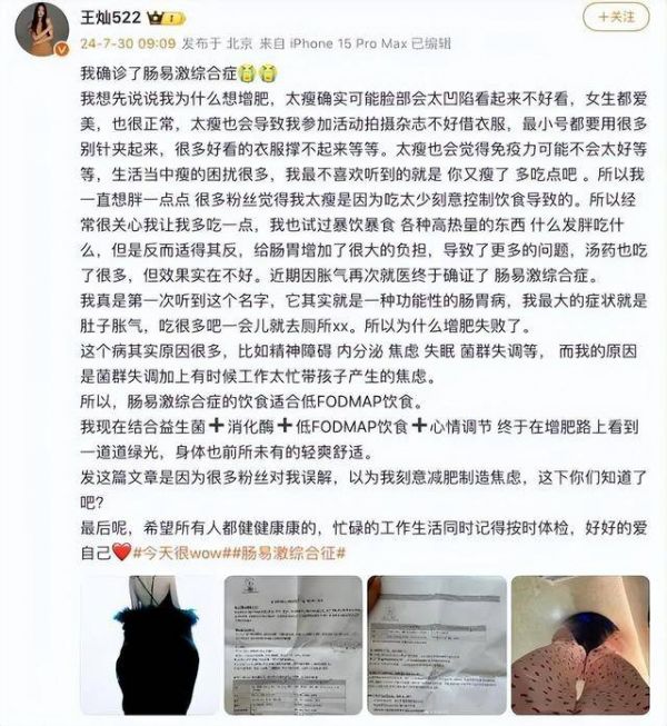這事得從7月30號說起,王燦在社交媒體上第一次跟大家說了自己的健康情況。她說自己得了腸易激綜合癥,這是一種腸道的病,雖然不會要人命,但是可把人折騰得夠嗆。