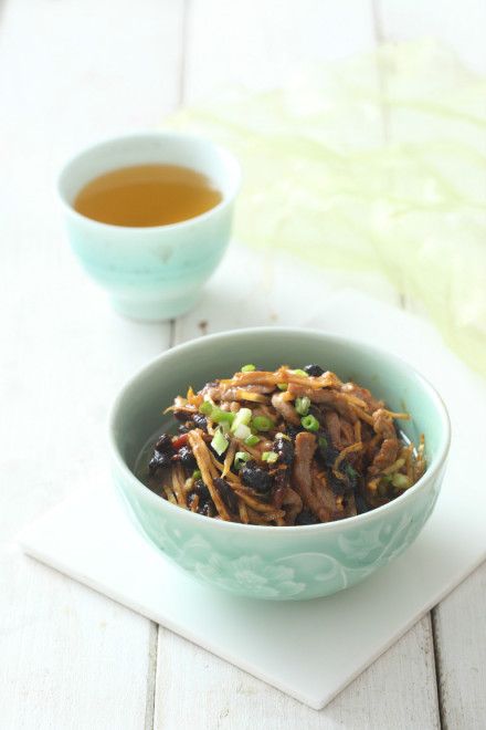 1.里脊肉切絲,用料酒、生抽腌制7分鐘。