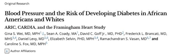 3. Wei, G.S., et al., Blood pressure and the risk of developing diabetes in african americans and whites: ARIC, CARDIA, and the framingham heart study. Diabetes Care, 2011. 34(4): p. 873-9.
