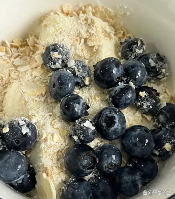 1、將酸奶倒入碗中,加入藍(lán)莓、燕麥片。