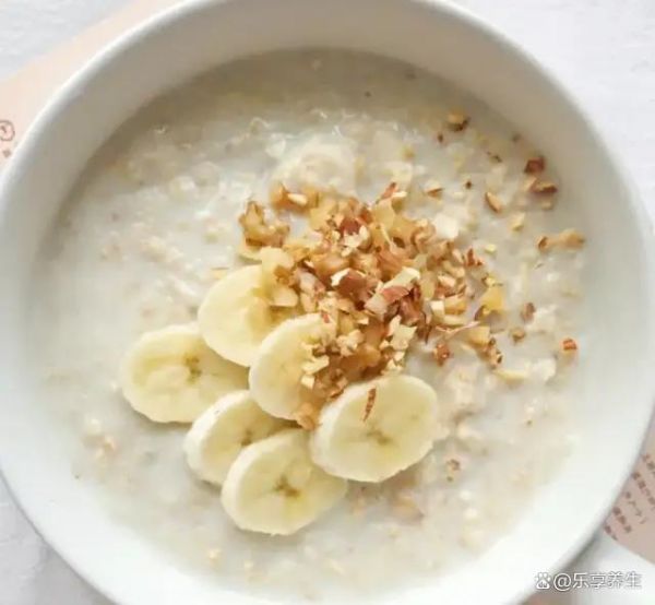 3、將煮好的燕麥粥倒入碗中,放上香蕉片和堅(jiān)果,最后淋上蜂蜜增甜即可。