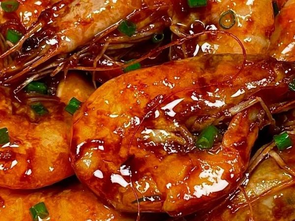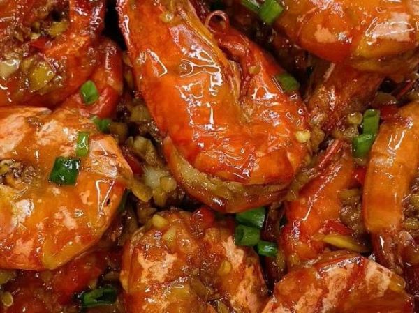 2、大蝦清洗干凈后瀝干水分,鍋中油熱蒜末、姜末和蔥花炒出香味,再放入大蝦翻炒片刻,炒至變色后倒入醬汁燜煮一會兒。