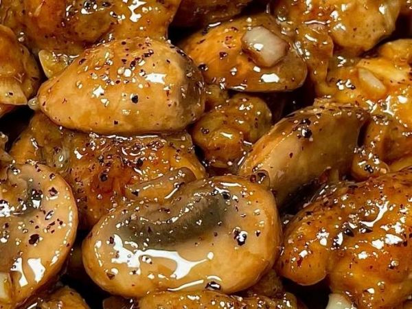 3、然后放入口蘑翻炒一會兒,炒出汁水后,加入生抽、蠔油、黑胡椒碎,翻炒均勻炒至入味,即可出鍋裝盤開吃。