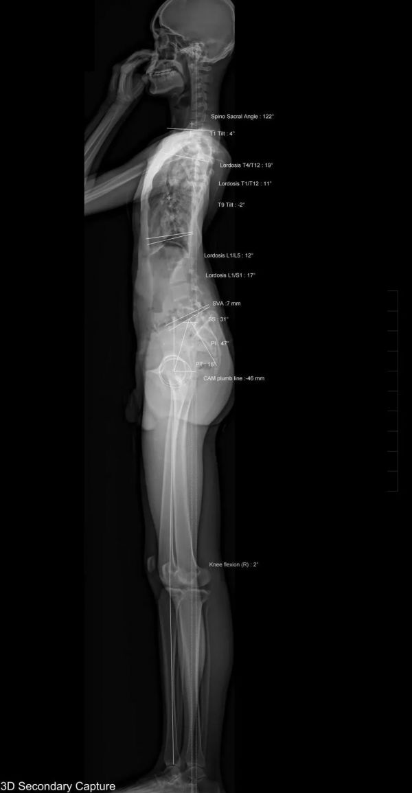 測(cè)量參數(shù)如下:胸椎后凸角 (TK:T1/T12)約11°,腰椎前凸角 《LL:L1/S1) 約17°,矢狀面軸向距離 (SVA) 7mm,骨盆入射角 (FI)約47°。