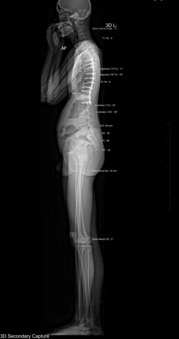 測(cè)量參數(shù)如下:脊柱矢狀位測(cè)量如下:胸椎后凸角 (T1/T12)約17°,腰椎前凸角 (L1/L5)約32°,矢狀面軸向距離 (SVA) 28mm,骨盆入射角(FI)約50°。