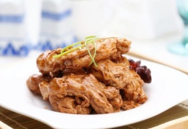素鴨脖子的做法 將素肉植物蛋白放入清水提前泡發(fā),蔥切末,蒜切片姜切片將泡發(fā)好的素肉放在干凈的毛巾蘸去多余的水分鍋熱放油,將素肉放入略煎,待到素肉的顏色變深即可撈出待用鍋內(nèi)留少許油放入蔥、姜、蒜、花椒、大料、小茴香煸炒出香味,放入醬油倒入素肉,加入少量的水蓋蓋略燜加入鹽、白糖、少許耗油,用水淀粉勾芡收汁,當然也可以慢慢將汁燉入素肉內(nèi),不用水淀粉,用水淀粉的就會比較亮姜辣鴨脖鴨爪