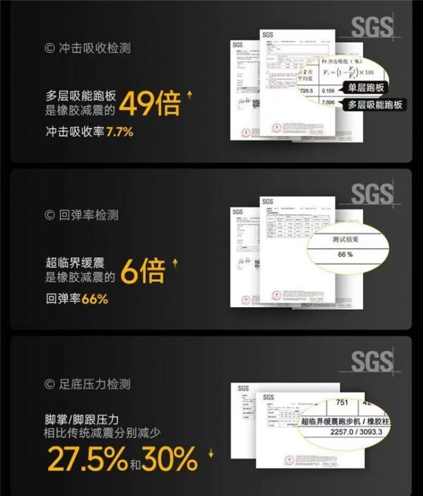 靜音升級:通過 “龍晶玻纖板 + EVA吸音棉 + 超臨界中底” 三層隔音結(jié)構(gòu),將跑帶摩擦聲、鞋底撞擊聲降至最低,經(jīng)全球知名第三方檢測機構(gòu)SGS實驗認(rèn)證,沖擊吸收能力達(dá)傳統(tǒng)減震的 49 倍,真正實現(xiàn) “護膝 + 靜音” 雙重突破。