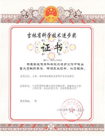 中國科學(xué)院長春應(yīng)用化學(xué)研究所聯(lián)合吉林農(nóng)大,吉林大學(xué),東北師范大學(xué)等十余家單位,經(jīng)多年的不斷開拓、奮力拼搏,在人參、西洋參的種植、加工標準化、炮制、配伍機理研究及系列產(chǎn)品開發(fā)、綠色生產(chǎn)技術(shù)示范推廣等方面取得了可喜的成果。近日,由長春應(yīng)化所作為第一承擔單位完成的“人參、西洋參標準化及系列產(chǎn)品開發(fā)研究”成果榮獲2009年吉林省科技進步一等獎。