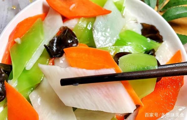 1、山藥萵筍和胡蘿卜切片、木耳泡發(fā)、大蒜切末。