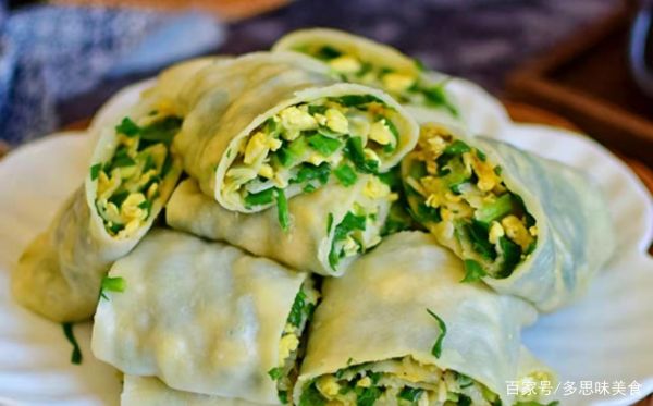4、把面團(tuán)分成三塊,每一塊都搟成薄片,把韭菜雞蛋餡鋪滿整個(gè)面片上面,