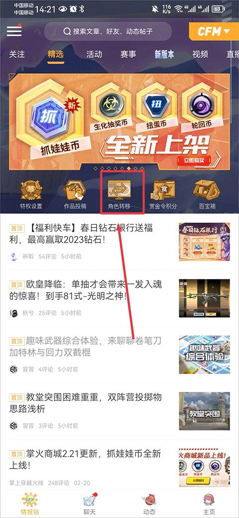 1、在情報站的精選界面中,點擊角色轉(zhuǎn)移