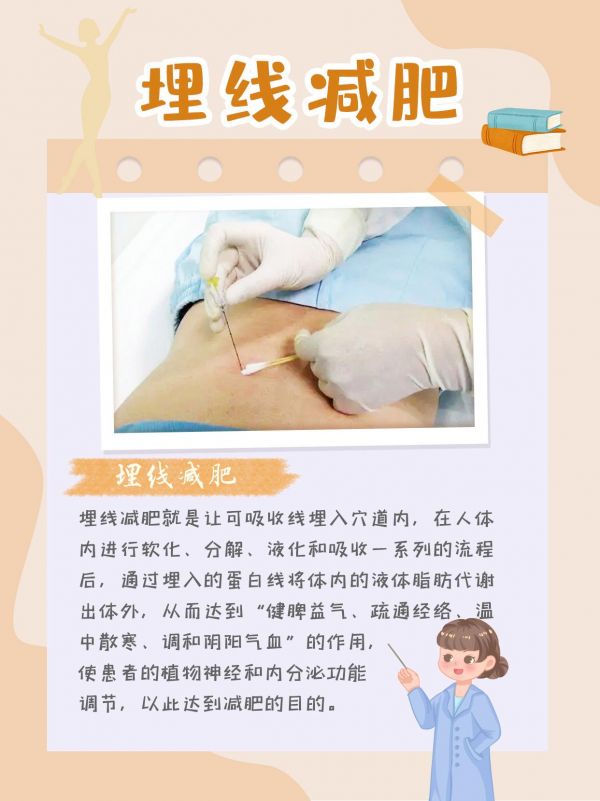 埋線減肥埋線減肥就是讓可吸收線埋入穴道內(nèi),在人體內(nèi)進(jìn)行軟化、分解、液化和吸收一系列的流程后,通過埋入的蛋白線將體內(nèi)的液體脂肪代謝出體外,從而達(dá)到“健脾益氣、疏通經(jīng)絡(luò)、溫中散寒、調(diào)和陰陽氣血”的作用,使患者的植物神經(jīng)和內(nèi)分泌功能調(diào)節(jié),以此達(dá)到減肥的目的。