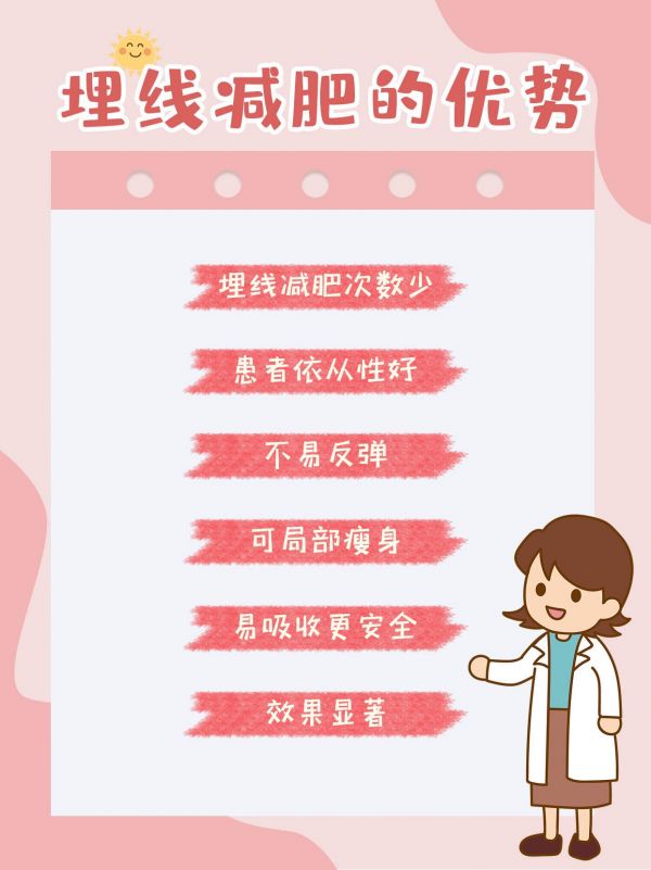 埋線減肥的優(yōu)勢1、埋線減肥次數(shù)少 2、患者依從性好3、不易反彈 4、可局部瘦身5、易吸收更安全 6、效果顯著