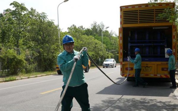供電人員將一臺(tái)720千瓦的發(fā)電車接入北鎮(zhèn)中學(xué)供電系統(tǒng)。