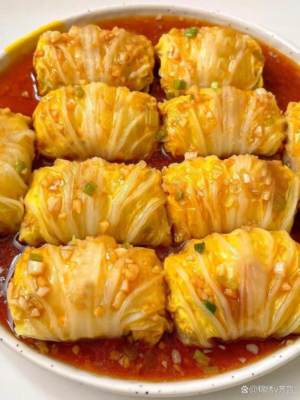2、白菜清洗干凈,放入開水中焯水煮至變軟,然后撈起來瀝干水分,鋪在案板上,放入肉末后卷起來包緊。