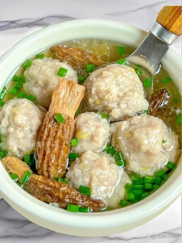 4、把羊肚菌肉丸放入蒸鍋中,蓋上蓋子蒸半個小時。蒸熟后取出來,撒上蔥花點綴即可端上桌開吃。