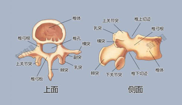 腰椎共有5塊,由前方圓柱形的椎體和后方椎板椎弓根和棘突組成的附件構成。其中椎體是腰椎負重的主要部分,內部充滿松質,表面的密質較薄,上下面粗糙,借椎間盤與鄰近椎骨相接。