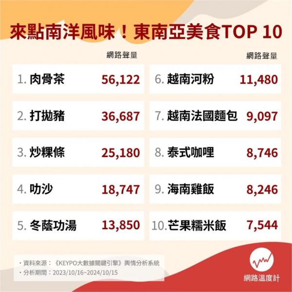 《網(wǎng)路溫度計(jì)DailyView》透過(guò)《KEYPO大數(shù)據(jù)關(guān)鍵引擎》輿情分析系統(tǒng),整理出網(wǎng)路討論熱度最高的十大東南亞料理。如果你最近特別想吃點(diǎn)異國(guó)風(fēng)味的重口味美食,不妨看看這些料理是否能勾起你的食欲。無(wú)論是冬蔭功湯、海南雞飯,還是河粉,每道菜都能讓你彷佛置身當(dāng)?shù)?,沐浴在熱情多彩的文化氛圍里。此外,《網(wǎng)路溫度計(jì)DailyView》每日更新「東南亞連鎖」口碑聲量排行榜,即時(shí)提供最新資訊。無(wú)論何時(shí)想滿足你的東南亞味蕾,都可以打開排行榜,找到最受歡迎的南洋美食店,輕松享受一場(chǎng)舌尖上的熱帶之旅!