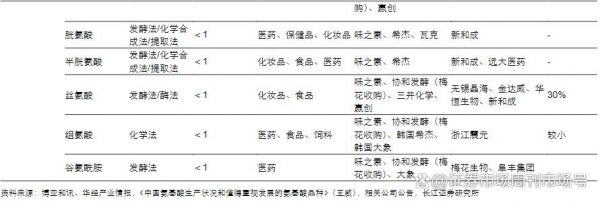 氨基酸有著較為廣泛的應(yīng)用,可用于藥品原料、健康食品、化妝品、調(diào)味劑、飼料等。氨基酸可以分為大品種氨基酸和小品種氨基酸。大品種氨基酸的主要應(yīng)用領(lǐng)域集中在食品、飼料添加等方面,國內(nèi)生產(chǎn)行業(yè)通過產(chǎn)能擴(kuò)張和行業(yè)整合,頭部企業(yè)集中化、規(guī)模效應(yīng)明顯。