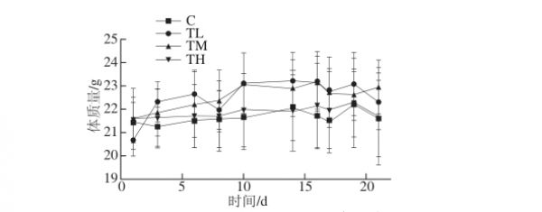 在整個實(shí)驗(yàn)周期內(nèi),小鼠健康狀態(tài)良好,沒有出現(xiàn)死亡或疾病情況,也未觀測到活動和行為的改變。同時TL、TM、TH組小鼠與C組小鼠在外觀上沒有明顯差異。由圖1可知,實(shí)驗(yàn)周期內(nèi)C、TL、TM、TH組小鼠體質(zhì)量無明顯差異,且沒有出現(xiàn)個別小鼠體質(zhì)量驟減的情況。