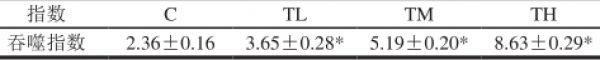 由表2可知,TL、TM、TH組的小鼠腹腔巨噬細(xì)胞吞噬能力均較C組小鼠腹腔巨噬細(xì)胞吞噬能力明顯增強(qiáng),并呈劑量依賴性,具有統(tǒng)計學(xué)意義(P<0.05),表明灌胃高、中、低劑量TPS對小鼠腹腔巨噬細(xì)胞的吞噬能力有積極影響。