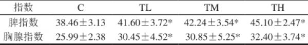 式中:m1為動物脾臟質(zhì)量/g;m2為動物解剖前體質(zhì)量/g;m3為動物胸腺質(zhì)量/g。