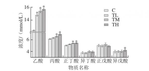 由圖2可知,TL、TM、TH組小鼠均較C組總SCFAs濃度明顯增大,并呈劑量依賴關(guān)系,具有統(tǒng)計學(xué)意義(P<0.05),表明灌胃茶多糖對小鼠總SCFAs的生成有積極影響。