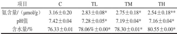 表3 不同劑量TPS干預(yù)后小鼠結(jié)腸內(nèi)容物中氨含量、pH值、含水量(n=12)