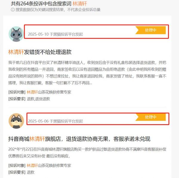 今年2月,林清軒北京朝陽門店因虛假宣稱“抗老”功效,而實際獲批僅為“抗皺、修護”,被區(qū)市場監(jiān)管局罰款2.1萬元。這并非偶發(fā)事件,早在2021年,其母公司上海林清軒生物科技有限公司就因宣稱產品“修復肌膚”缺乏實證,被上海市監(jiān)局罰款5萬元。五年內兩度因虛假宣傳被罰,不僅戳破了“科技護膚”承諾,消費者信任崩塌也正在發(fā)酵。據黑貓投訴平臺統(tǒng)計,與林清軒相關投訴達264起,其中“功效不符”、“退款糾紛”占比較高。值得注意的是,林清軒的投訴近兩個月進展多顯示為“處理中”或“待分配”,鮮少有“已完成”。這似乎也是林清軒的“老毛病”,在此之前林清軒也曾被曝客服態(tài)度差等問題??梢姡智遘幍膽獙Ψ椒榱P單-投訴-冷處理的循環(huán)。當高端市場用回購率投票時,信任赤字遠比財務赤字更難修復。與此同時,不少消費者也在社交媒體直言林清軒“漲價較多”、“吃相難看”。