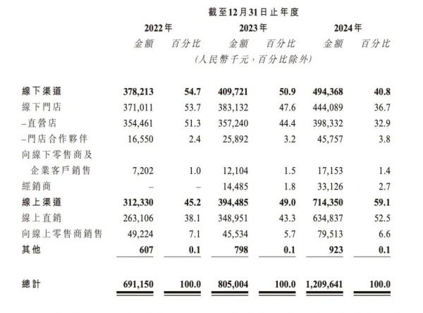 過去三年,林清軒以日均新增1.3家店的速度將線下店鋪從366家擴至506家,其中95%扎堆高端商場,數量碾壓多數國際品牌。值得注意的是,從2022年至2024年林清軒線下收入貢獻不增反降,從54.7%萎縮至40.8%,線下門店卻淪為流量漏斗。記者根據招股書中營收與門店數算了一筆賬,單店年均產出從2022年的1030萬元降至2024年978萬元。