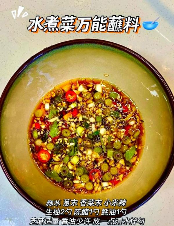 將1勺陳醋、2勺生抽、適量的蒜末、香菜末、小米辣、白芝麻、蠔油以及適量的香油,與適量清水混合,攪拌均勻即可。這款萬能蘸料能搭配各種水煮菜肴,為您帶來鮮美與健康的味蕾盛宴。