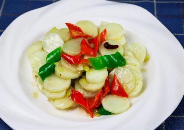 3.重新起鍋添入少許食用油,放入姜蒜,紅干椒爆香,再倒入山藥,添入少許清水,開始調(diào)味,加入食鹽,雞粉,白糖,快速翻炒均勻。