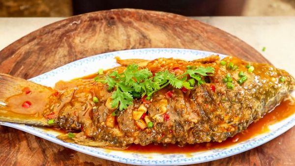 5.最后加入少許陳醋去腥增香,把湯汁不斷地澆在魚身上,把魚燉好以后放入盤子里面。把熬好的湯汁澆在魚身上,撒上蔥花點(diǎn)綴,就可以端上桌食用了。