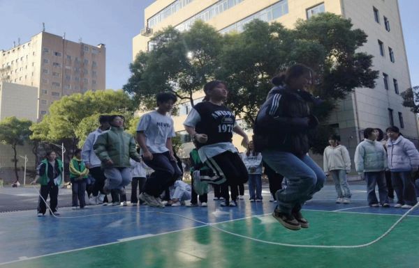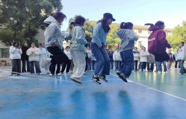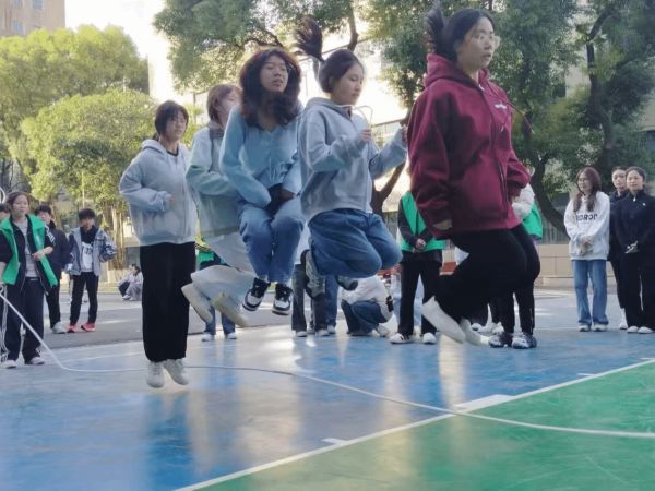 花樣跳繩比賽把總?cè)藬?shù)分成幾個(gè)人數(shù)相等的隊(duì)伍,每個(gè)隊(duì)伍中有兩人負(fù)責(zé)搖繩其余負(fù)責(zé)跳繩。比賽過程中繩子的挨地聲、志愿者的報(bào)數(shù)聲與學(xué)生們的起跳聲相互交織,充滿了青春活力。哨響一出,時(shí)間到了,學(xué)生紛紛喘著粗氣討論跳了多少個(gè)、跳得怎么樣,充分展現(xiàn)了大家的熱情。