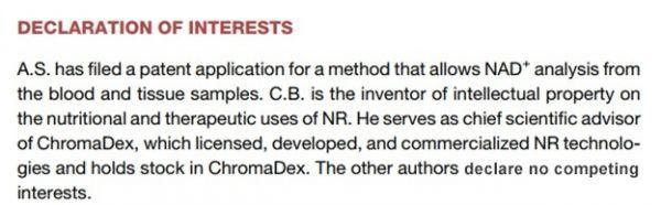 首先從通訊作者A.S.來說,他申請的專利是NAD+的分析方法,這個專利和這篇研究的結(jié)論并無直接關(guān)系,也不會對這篇研究的結(jié)果有利益相關(guān)的影響。而作者C.B.就是大家熟知的Charles Brenner博士,我在專欄中提到過多次他是NR的強利益相關(guān)者,持有NR生產(chǎn)商Chromadex公司的股份并且是Chromadex的首席科學(xué)顧問,打擊NMN專業(yè)戶。然而這篇臨床測試的是尼克酸,和NR沒半點關(guān)系。除非是C.B.需要利用尼克酸來打擊NMN,否則他的利益相關(guān)對這篇研究結(jié)果也造成不了影響。所以總結(jié)來說,這篇研究屬于輕利益相關(guān)或者說無利益相關(guān)的研究。