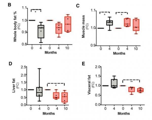 在提升NAD+水平的基礎(chǔ)上,尼克酸還被發(fā)現(xiàn)可以同時改善肌肉病變病人和健康人的身體構(gòu)成。這其中包括降低全身體脂(健康人,圖B),增加肌肉質(zhì)量(所有受試者,圖C),降低肝臟脂肪達50%(病人組,圖D)以及降低內(nèi)臟脂肪25%(病人組,圖E)。