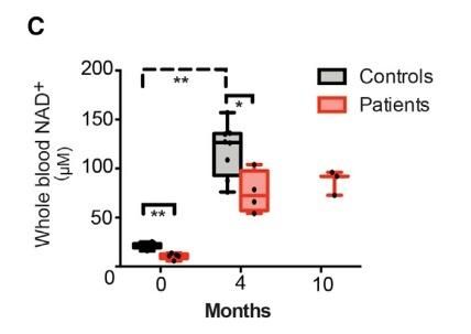 這篇研究的結(jié)果非常正面,血液中NAD+的水平提升非常明顯,所有受試者的NAD+水平顯著提高,其中病人組的NAD+濃度在4個月的時候達到了測試前的7.1倍,在10個月的時候達到了8.2倍。在健康人組中血液NAD+的濃度在4個月的時候達到了測試前的5.7倍。在肌肉病變的病人中,尼克酸在4個月和10個月的時候讓他們肌肉中NAD+水平增長了1.3倍和2.3倍。在10個月的時候這些病人肌肉中的NAD+水平已經(jīng)接近健康人水平