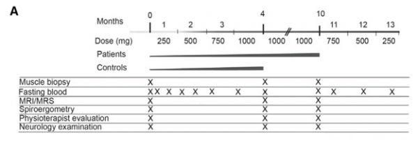 接下來,大概描述一下這篇研究的方法。研究團隊招募了5個有線粒體肌肉病變的病人(1男4女)以及10個健康人(2男8女)作為對照組。對照組服用尼克酸4個月,病人組服用尼克酸10個月。尼克酸劑量從250mg每天逐漸增加到每天750mg到1000mg(大約是14-18mg/kg病人體重)。對于研究結(jié)果除了比較病人組和對照組以外,所有受試者在服用尼克酸之前和臨床結(jié)束的狀態(tài)也進行了比較。這樣不僅可以看出病人組與對照組的差距,也可以看出病人和健康人服用尼克酸一段時間以后對自身情況的變化。另外值得一提的是,這篇研究中對于肌肉細胞內(nèi)NAD+水平的取樣是采用了活體穿刺的方式,這應(yīng)該是最直接也是最準(zhǔn)確的測試細胞內(nèi)NAD+水平的方式了。
