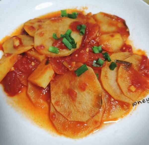 番茄劃十字開水燙后撕去皮,切成小塊;土豆去皮,切成小塊或者薄片,水開后放入土豆片,煮到七八成熟。蒜切末,蔥切蔥花,鍋里熱油爆香;倒入番茄炒軟(會出汁),再放入七成熟的土豆翻炒均勻。加入1勺生抽、1小勺蠔油、小半匙鹽(可不加),適量糖,翻炒均勻;煮到土豆軟爛,即可出鍋撒上蔥花。(如果覺得土豆不夠軟,可以加少量水蓋上蓋子燉煮收汁)。