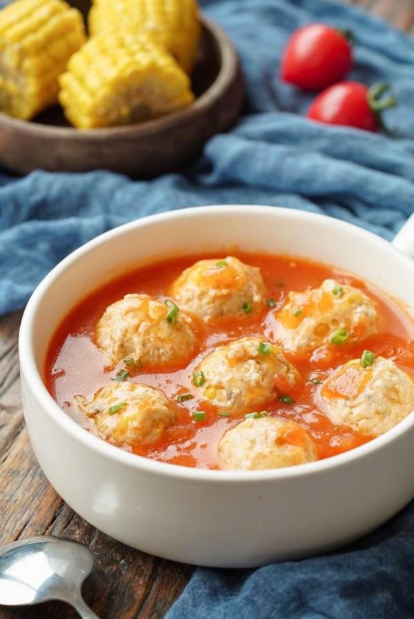 170g雞胸肉剁成泥,打入一顆雞蛋,加1顆切碎的香菇、30g玉米粒、1勺鹽、1/4勺白胡椒粉、1勺姜末(不愛吃姜可以不加)、1勺料酒和3勺清水,攪拌至粘稠。用虎口擠出肉泥再用勺子舀起,就是一個雞肉丸子。丸子焯水,在水快要煮沸但還沒煮沸時入鍋,小火煮至浮起后撈出。3個番茄去皮切?。梢詣澥址湃腴_水中燙一下,好剝皮),另起鍋開小火,倒入少許橄欖油(可加1瓣蒜末炒香),放入番茄丁翻炒至略微軟爛后加一碗熱水煮開后下丸子煮至黏稠后加少許鹽調(diào)味出鍋撒蔥末,完成!