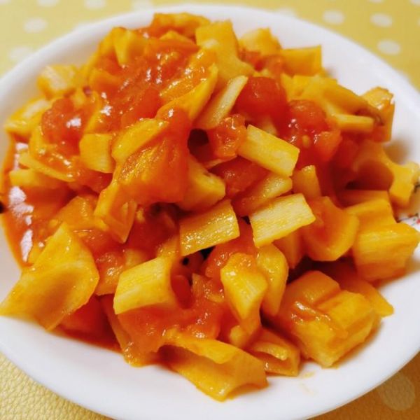用料 藕(中等大小)一節(jié) 番茄沙司三湯勺 西紅柿一個 糖一湯勺 鹽按口味