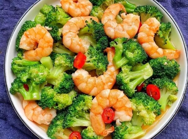 準(zhǔn)備食材:西蘭花,大蝦,生姜,大蒜,食用鹽,食用油