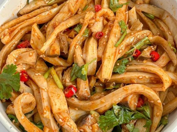 1、準(zhǔn)備杏鮑菇洗干凈,撕成條,香菜洗凈切碎,小米辣切圈,蒜切末備用。