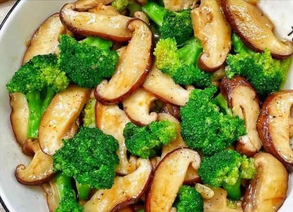 3、鍋中燒油,油熱下入蒜末炒香,下入香菇片和西藍花,翻炒,加一勺蠔油、一點鹽和黑胡椒調(diào)味,翻炒均勻即可出鍋。