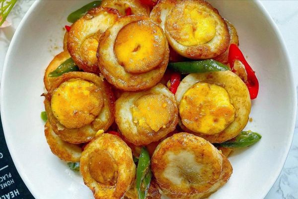 5、雞蛋片先下鍋小火煎至2面金黃定型,留下少許的底油,起鍋燒油把青紅辣椒爆香,味道一出來就放入煎好的雞蛋,然后加入調(diào)好的醬汁,開大火翻炒幾輪,把醬汁和食材都炒均勻了,即可出鍋裝盤。
