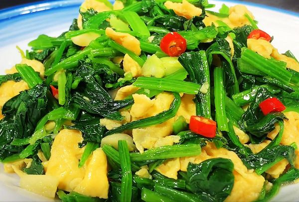 準(zhǔn)備食材:菠菜、小米椒、大蒜、雞蛋