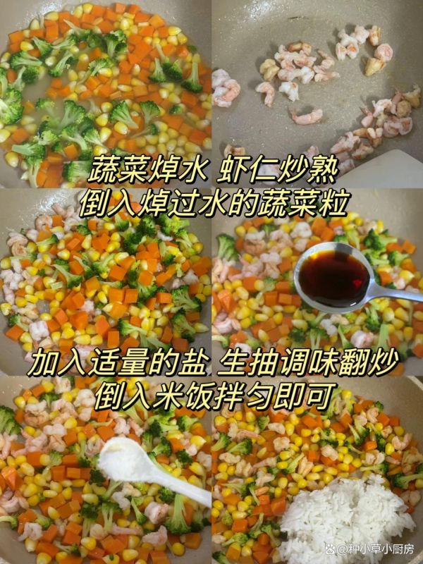 食材:蔬菜(西蘭花、胡蘿卜、玉米)、蝦仁、米飯、鹽、生抽