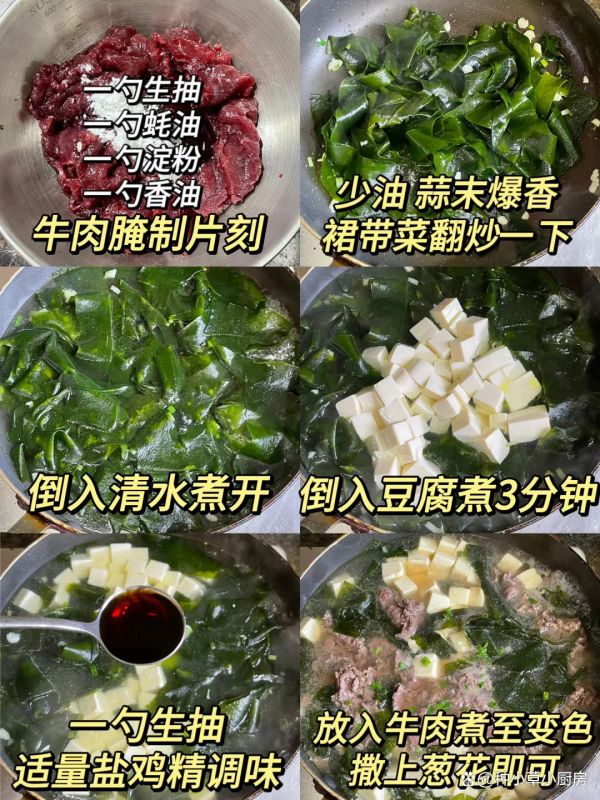 食材:牛肉、生抽、蠔油、淀粉、香油、裙帶菜、蒜末、豆腐、鹽、雞精、蔥花
